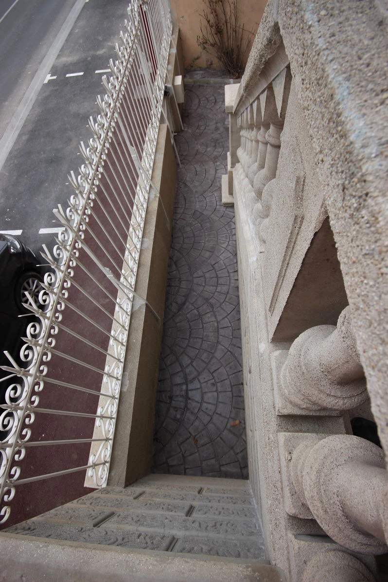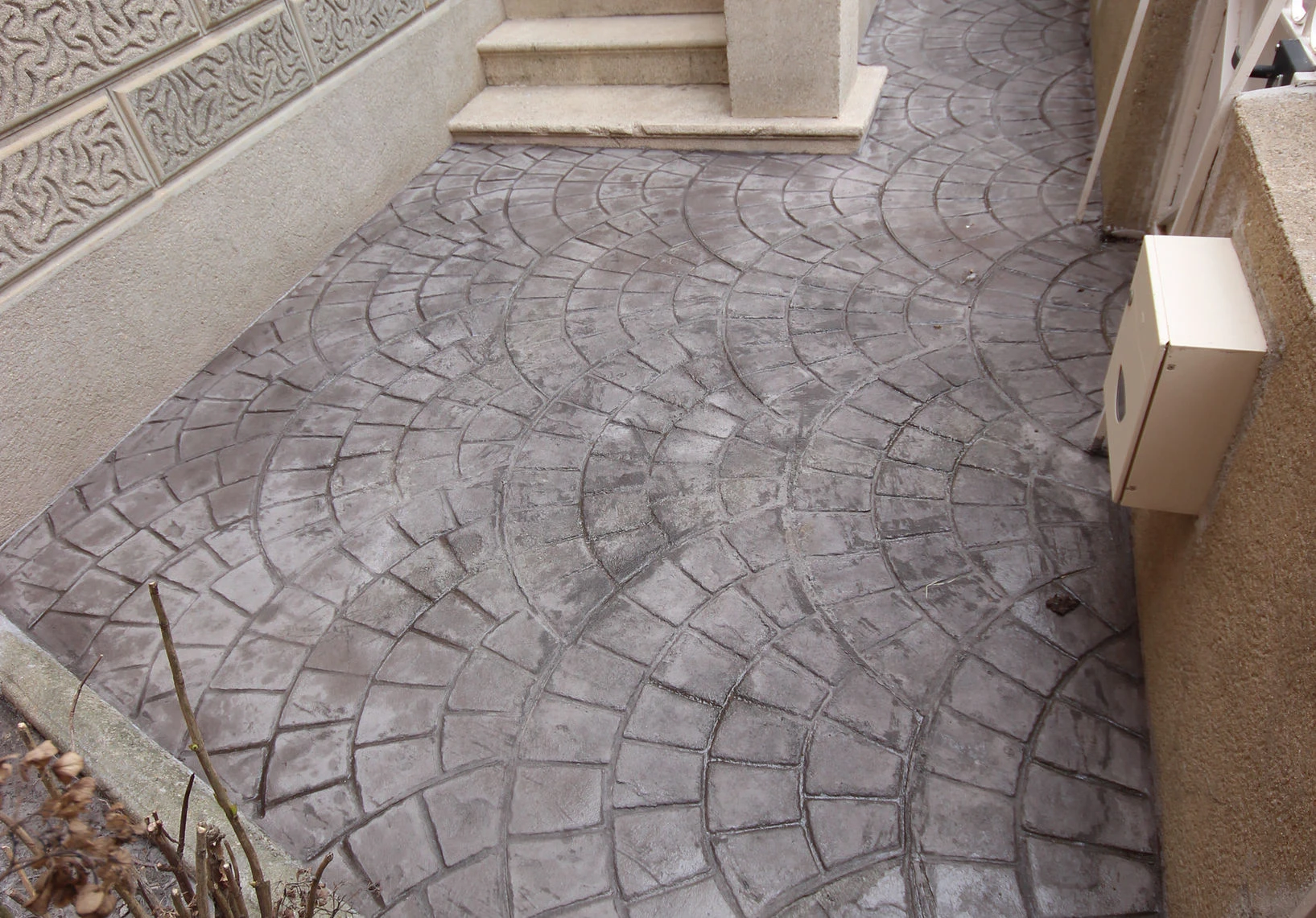 Réalisation d'une dalle béton imprimé avec motif pavé parisien.