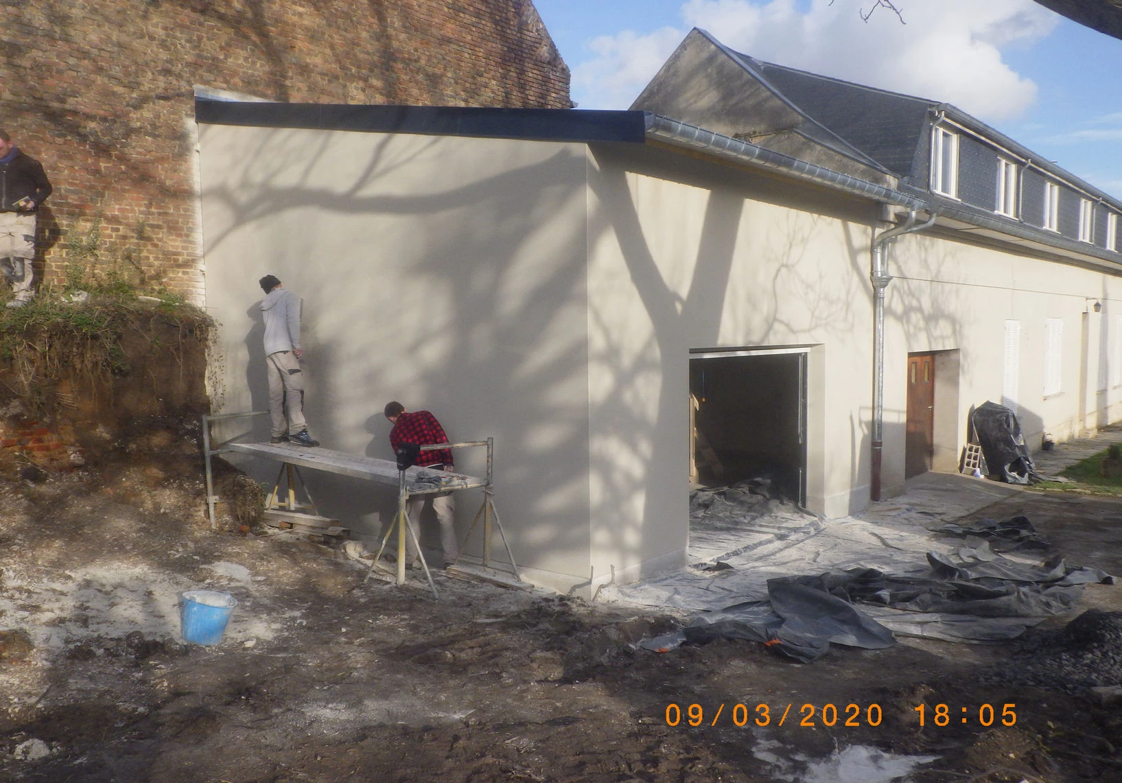 Le garage est construit en parpaing creux 20x20x50. Sur la façade avant, la finition extérieure est en enduit monocouche gratté de chez WEBER.