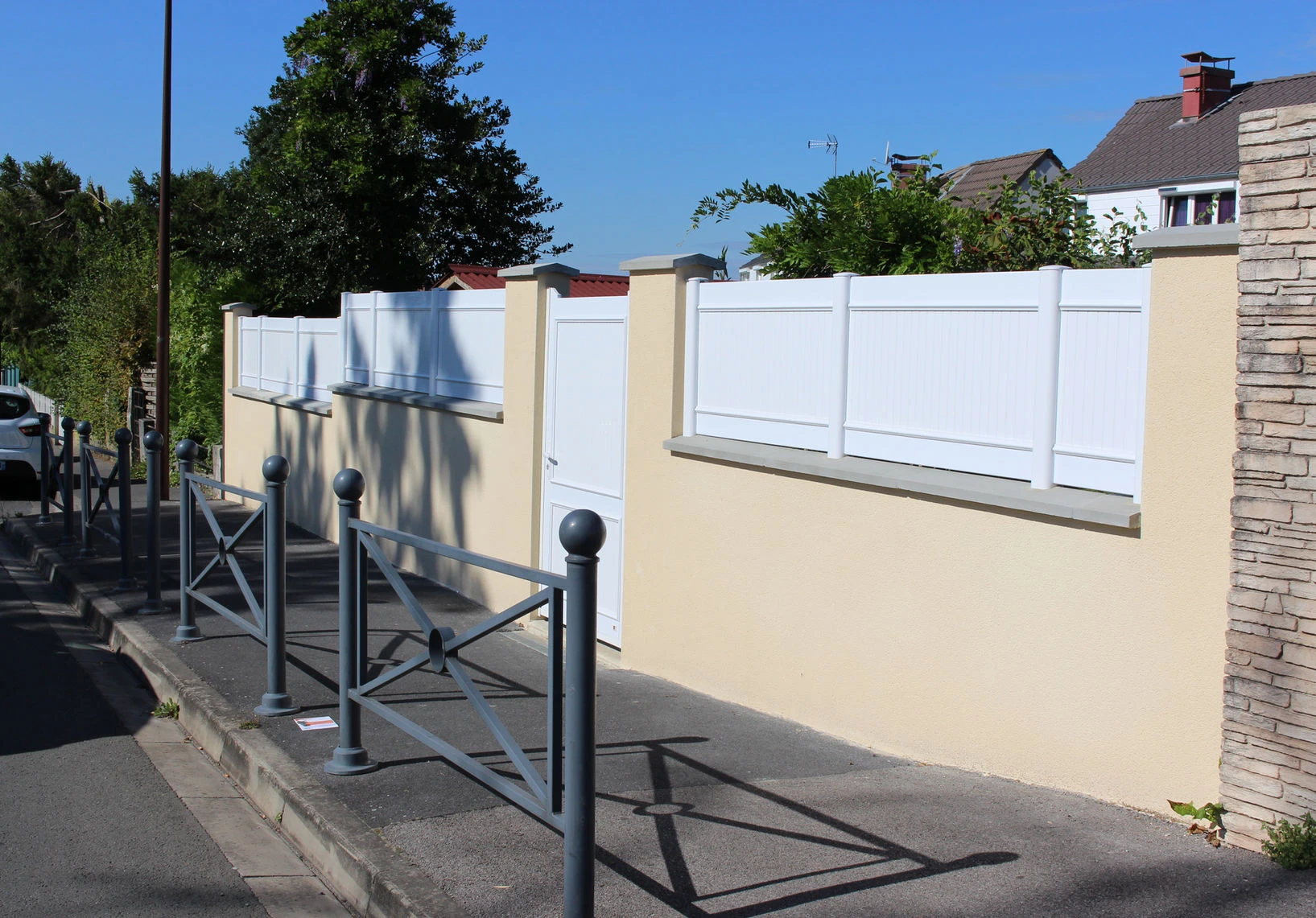 Coloris ton pierre avec pare-vue lame pleine en PVC Blanc.