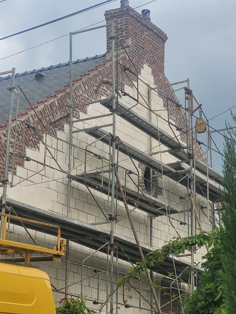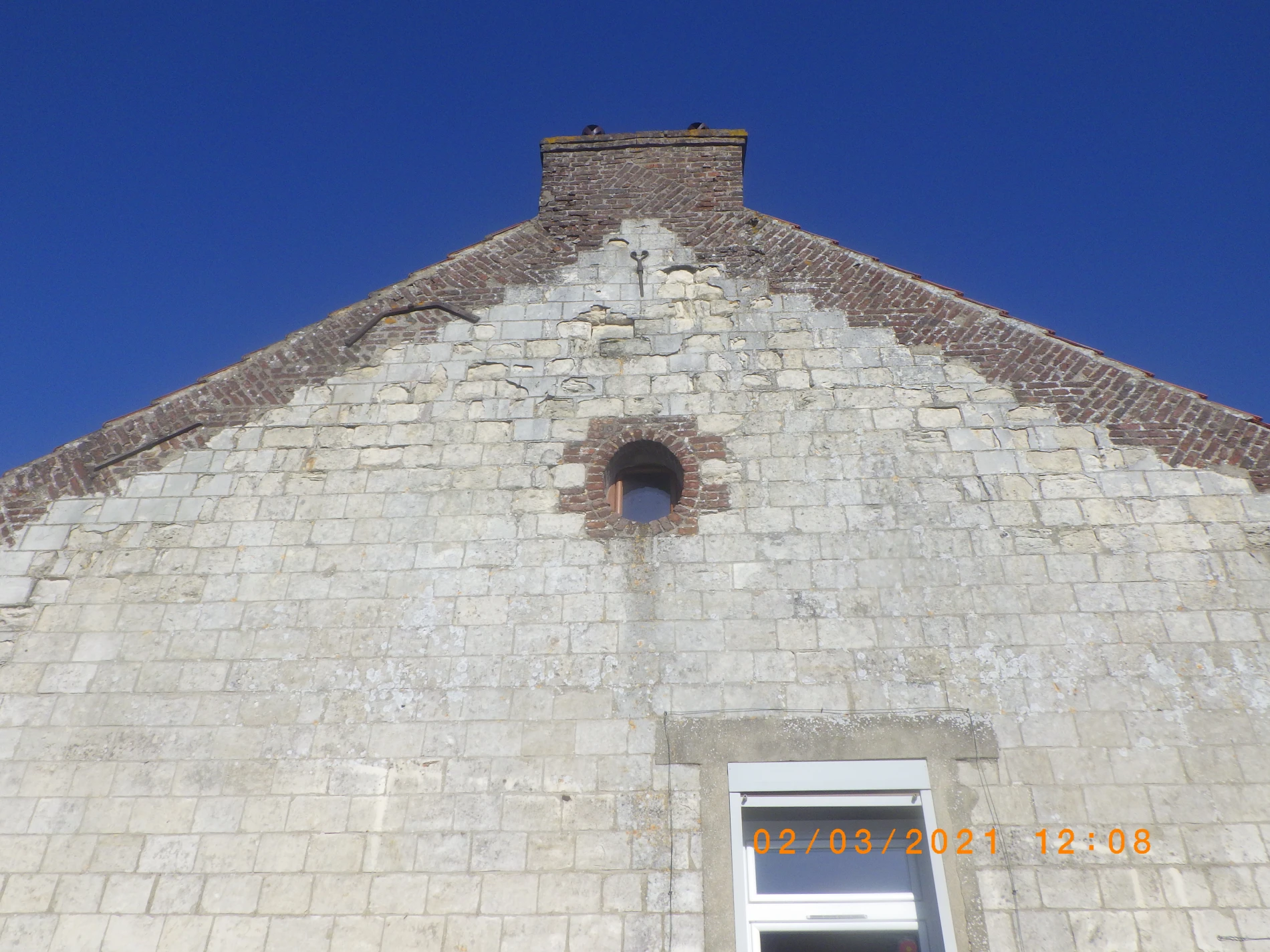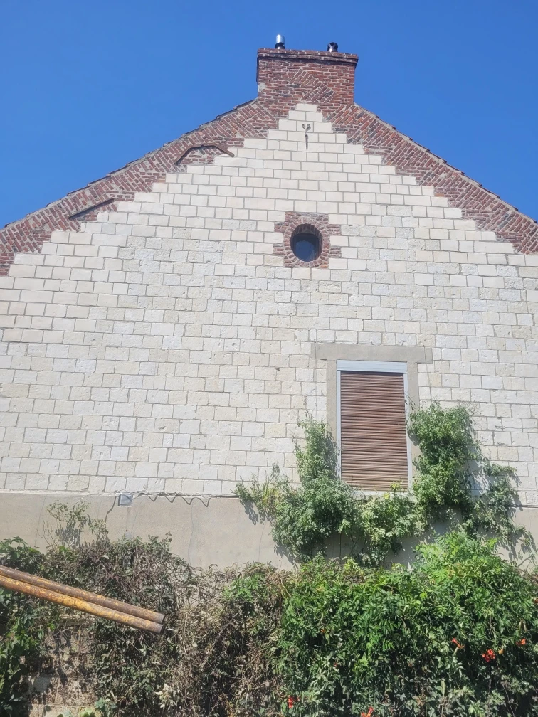Nous avons redonné un coup de jeunesse à ce beau pignon en pierre naturelle (craie) et brique en réalisant un nettoyage à l'aide d'une sableuse (hydrogommage), nous avons purgé et remplacé les parties en pierre détériorée avec le temps, ensuite, nous avons utilisé un produit spécialement conçu au support de pierre et nous avons fini avec un produit hydrofuge laissant respirer la structure pour une protection contre les intempéries.