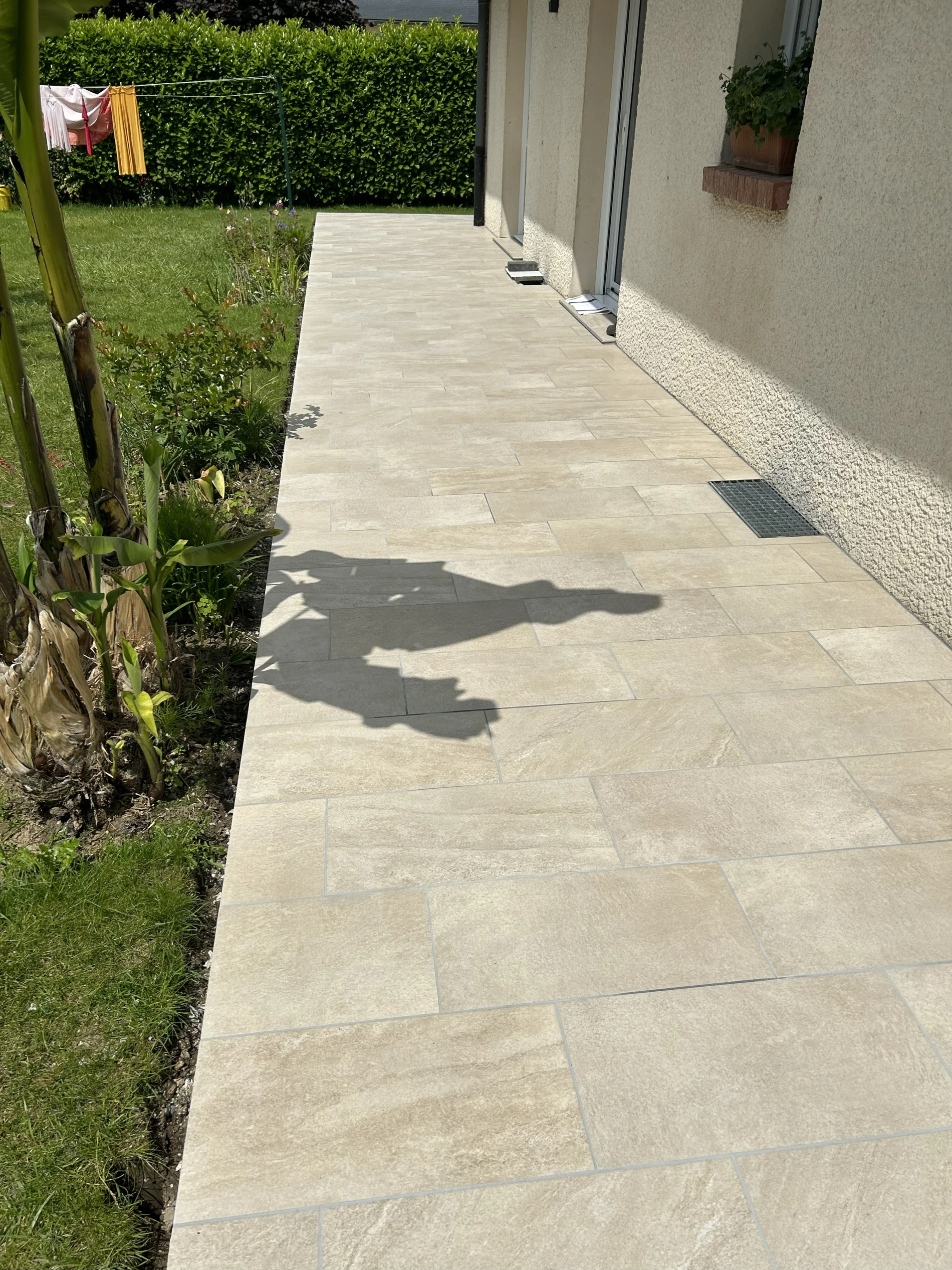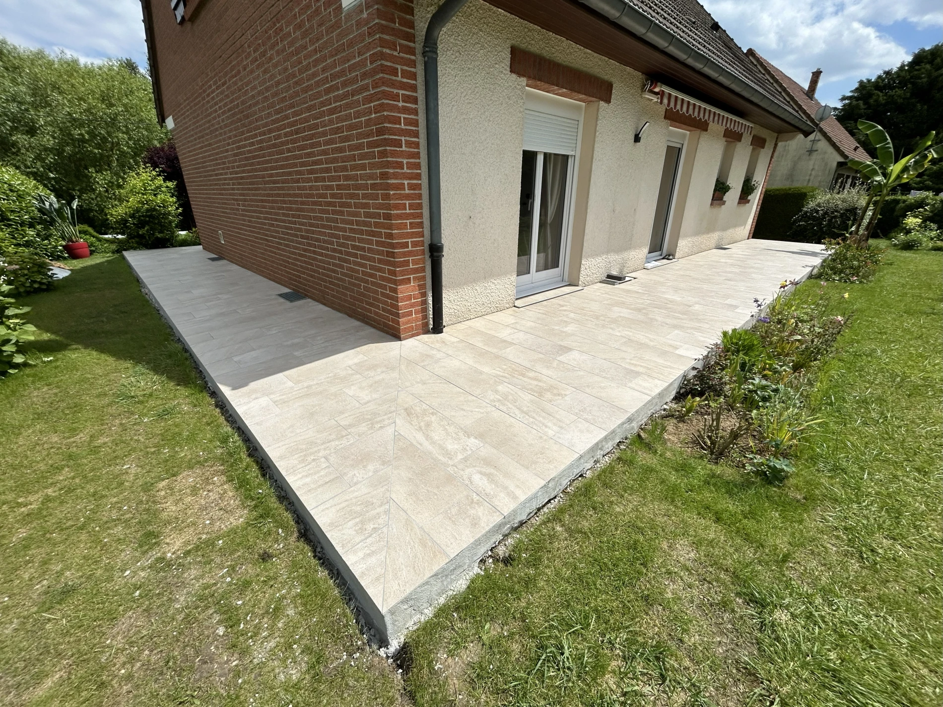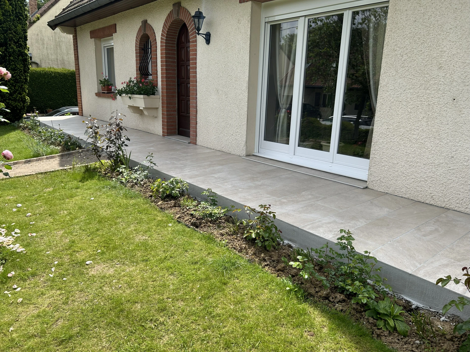 Réfection d'une terrasse extérieure comprenant la démolition de l'ancienne terrasse, réalisation d'une nouvelle dalle béton avec la pose d'un carrelage extérieur 30x60 imitation parquet.